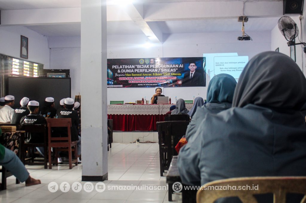 Genggong — Perwakilan Organisasi Siswa Intra Sekolah (OSIS) dari berbagai lembaga pendidikan se-Genggong Raya berkumpul di Aula Barozain P5 pada Senin (19/01) untuk mengikuti seminar bertajuk “Membangun Generasi Cerdas dan Beretika di Era Digital: Bijak dalam Menggunakan AI”. Kegiatan ini digelar sebagai upaya meningkatkan literasi digital di kalangan pelajar, khususnya dalam pemanfaatan teknologi Kecerdasan Buatan (Artificial Intelligence/AI) secara positif dan bertanggung jawab.